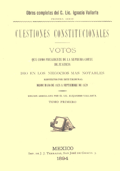 [Obra de Ignacio Vallarta] Cuestiones constitucionales: votos que como presidente de la Suprema Corte de Justicia dio en los negocios más notables resueltos por este tribunal desde mayo de 1878 a septiembre de 1879