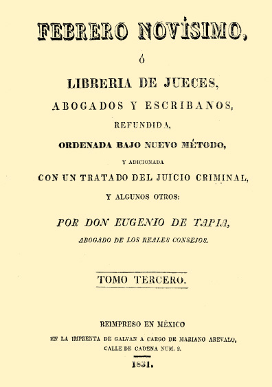 Librería de jueces, abogados y escribanos, refundida, ordenada bajo nuevo método y adicionada con un tratado del juicio criminal