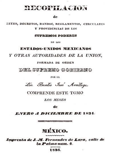 Recopilación de leyes, decretos, bandos, reglamentos, circulares y providencias de los supremos poderes y otras autoridades de la República Mexicana, t. VI, enero a diciembre de 1834