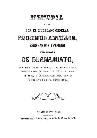 Memoria leída por el ciudadano general Florencio Antillón, gobernador interino del estado de Guanajuato, en la solemne instalación del Segundo Congreso Constitucional. Colección Jorge Denegre-Vaught Peña