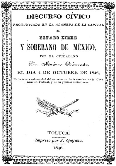 Discurso cívico, pronunciado en la Alameda de la capital del Estado Libre y Soberano de México, por el Lic. Mariano Arizcorreta, el día 4 de octubre de 1846. Colección Jorge Denegre-Vaught Peña