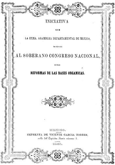 Iniciativa que la exma. Asamblea Departamental de México, ha elevado al soberano Congreso Nacional, sobre las reformas de las Bases Orgánicas. Colección Jorge Denegre-Vaught Peña