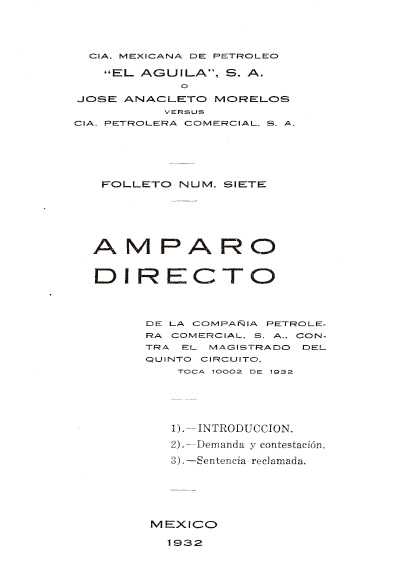 Amparo indirecto, promovido por la Compañía Petrolera Comercial, en contra del magistrado del Quinto Circuito. Toca 10002 de 1932. Colección Jorge Denegre-Vaught Peña