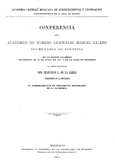 Conferencia del académico de número, licenciado Manuel Calero, secretario de Justicia, en la sesión solemne celebrada el 20 de julio de 1911. Colección Jorge Denegre-Vaught Peña
