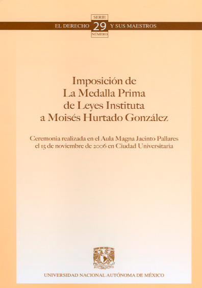 Imposición de la medalla “Prima de Leyes Instituta” al doctor Moisés Hurtado González. Ceremonia realizada en el Aula magna Jacinto Pallares el 15 de noviembre de 2006 en Ciudad Universitaria. Colección Facultad de Derecho